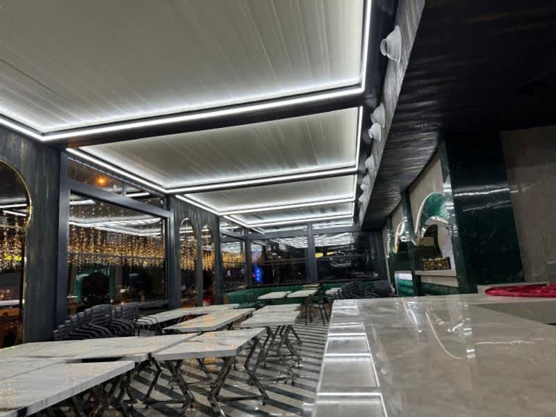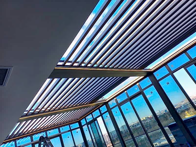 Bioklimatik Sistemler, katlanma ve toplanma özelliklerini bir arada sunarak %5 eğimle çalışır ve su tahliyesi sağlar. Su almama garantisi olan bu sistem, 8 metreye kadar tek ünite olarak üretilebilir; daha uzun ölçülerde ise birden fazla ünite ile uygulanır. Paslanmaz profiller ve aksesuarlarla donatılan sistem, hareket algılayıcı switchlerle güvenlik sağlar.