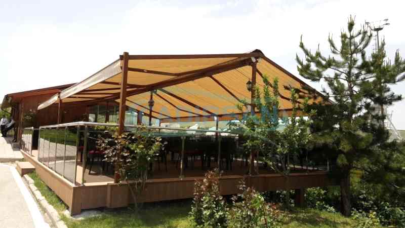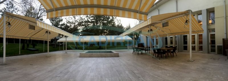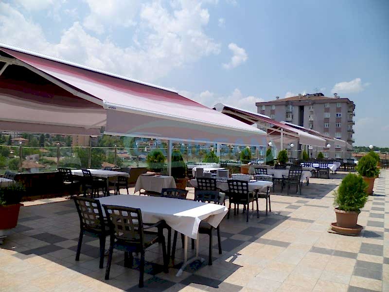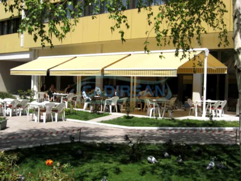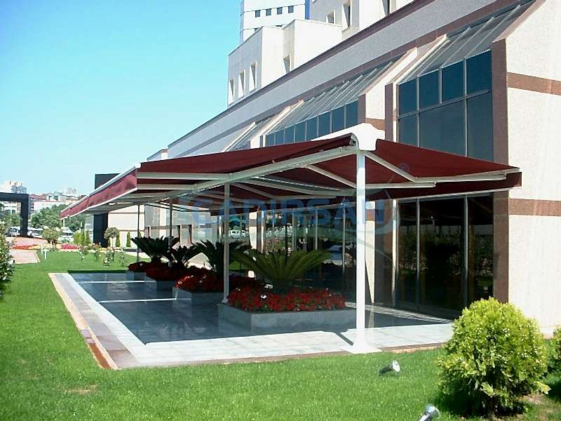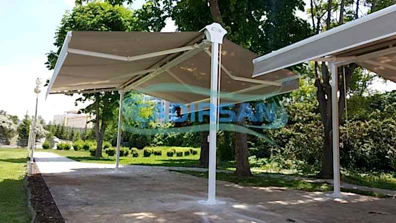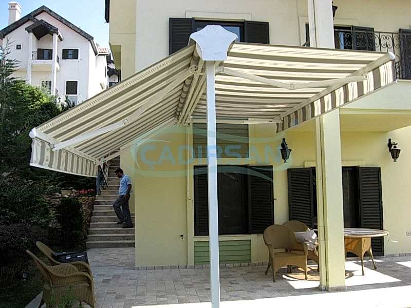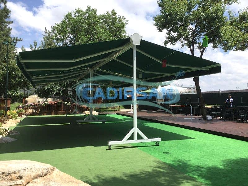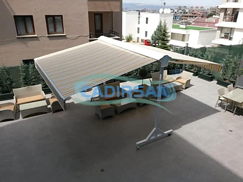 Çift yöne açılımlı tente modelimiz ister yere sabit ister tekerlekli sistem ile oldukça kullanışlıdır. Kasetli tente ve mafsallı tente sistemleri kullanılarak üretilir. Çift yöne açılımlı tenteler ister aynı anda iki yöne, sağa ve sola olmak üzere açılabilir ya da bir tente kapalı iken diğerlerinin açık kalması sağlanarak tente kullanım alanının isteğe bağlı olarak belirlenmesi sağlanabilir. Bu modelde konstrüksiyonun üst kısmına, tentelerin korunması ve aralarından aşağıya su akmaması için alüminyum koruma çatısı konulmaktadır. Branda özellikleri müşteri talebine göre değişiklik göstermektedir.